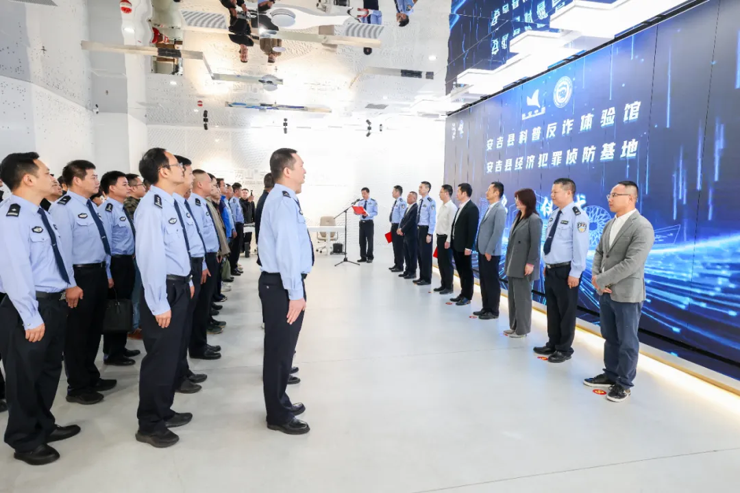為深入服務全縣高質量發展大局,助力營造安全、穩定、公正的營商環境,10月22日,安吉縣科學技術協會聯合縣公安局、縣建控集團、縣經濟犯罪偵防協會共同籌建的安吉縣科普反詐體驗館(安吉縣經濟犯罪偵防基地)正式揭牌啟用。湖州市科協黨組成員、副主席林孫朗,安吉縣副縣長、公安局局長王愛國,安吉縣科協黨組書記、主席程暉等領導出席儀式。